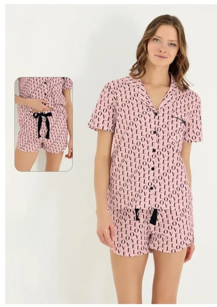 - نقش أنيق بكلمة "LOVE" يمنح البجامة طابعًا أنثويًا جذابًا.