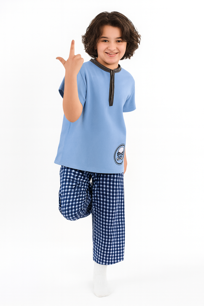 وفري لابنك إطلالة أنيقة ومريحة في أوقات الاسترخاء مع بيجاما ولادي بتصميم كاروهات عصري، تجمع بين البساطة والذوق الرفيع بخامة قطنية مريحة تناسب الاستخدام اليومي في كل الفصول.